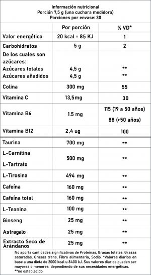 Polvo para preparar bebida analcohólica dietética con cafeína y taurina suplementada con vitaminas.